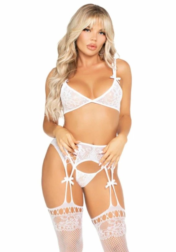 Leg Avenue prezentuje elegancki, 3-częściowy zestaw bielizny w klasycznym białym kolorze.